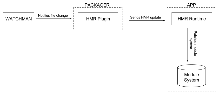 Hot Reloading is built on top of a feature Hot Module Replacement, or HMR. It was first introduced by webpack and we implemented it inside of React Native Packager. HMR makes the Packager watch for file changes and send HMR updates to a thin HMR runtime included on the app.