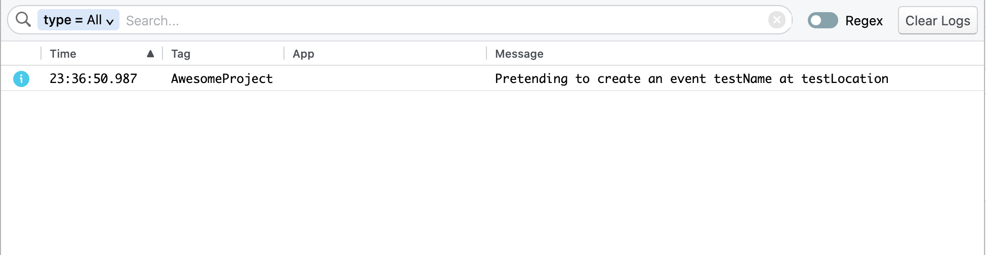 You should now be able to invoke your createCalendarEvent() method on your native module in JavaScript. Since you are using RCTLog in the function, you can confirm your native method is being invoked by enabling debug mode in your app and looking at the JS console in Chrome or the mobile app debugger Flipper. You should see your RCTLogInfo(@"Pretending to create an event %@ at %@", name, location); message each time you invoke the native module method.